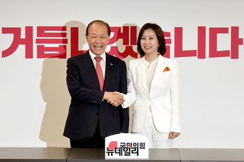 허은아 개혁신당 대표가 21일 오전 서울 여의도 국민의힘 중앙당사에서 황우여 비상대책위원장을 예방해 기념촬영을 하고 있다.