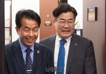 박찬대 더불어민주당 원내대표와 윤종오 진보당 원내대표가 20일 오후 국회 더불어민주당 원내대표실에 함께 입장하고 있다.