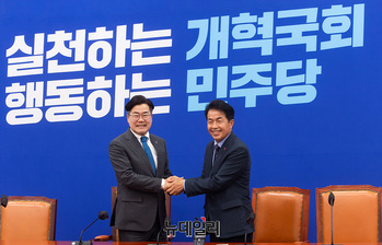 박찬대 더불어민주당 원내대표와 윤종오 진보당 원내대표가 20일 오후 국회에서 인사하고 있다.