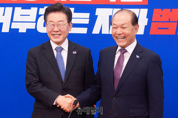 황우여 국민의힘 비상대책위원장과 이재명 더불어민주당 대표가 20일 오후 국회 당대표 회의실에서 접견하고 있다.