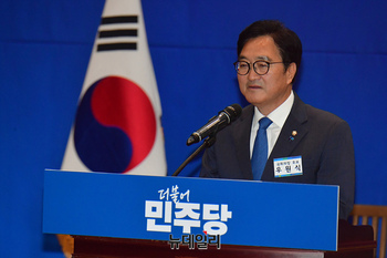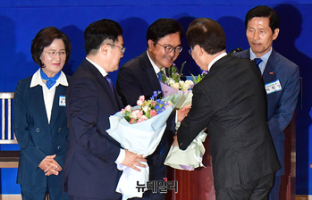 [포토] 우원식 당선자에게 꽃다발 전달하는 이재명 대표