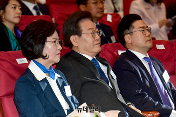 이재명 더불어민주당 대표와 추미애 의원이 16일 오전 국회 의원회관에서 열린 제22대 국회 전반기 국회의장단 후보 선출 당선자총회에서 국회의장 후보로 선출된 우원식 의원의 수락연설을 지켜보고 있다.