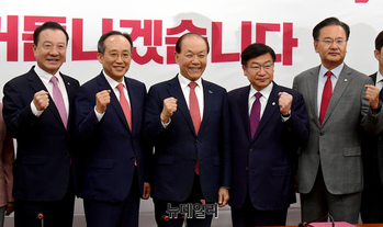 황우여 국민의힘 비상대책위원장, 추경호 원내대표 및 비대위원·주요당직자들이 16일 국회에서 열린 임명장 수여식에서 기념촬영을 하고 있다.