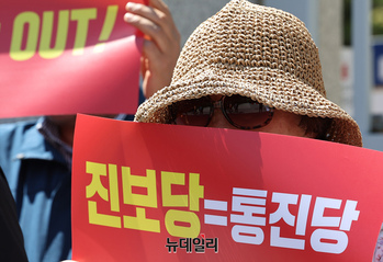 자유민주당이 14일 오후 경기 정부과천청사 앞에서 진보당 해산심판 청원 제출에 앞서 입장을 밝히고 있다. 고 대표는 "진보당은 2014년 위헌 정당 판결로 강제해산 된 통합진보다(통진당)의 후신이다"며 "당 강령에는 한미동맹 파기, 주한미군 철수, 민중주권을