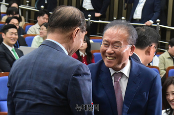 윤재옥 국민의힘 원내대표가 9일 국회에서 열린 2024 원내대표 선출 당선자총회에 참석해 황우여 비상대책위원장과 악수를 나누고 있다.