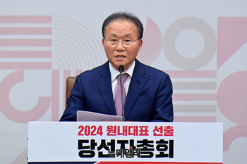 윤재옥 국민의힘 원내대표가 9일 국회에서 열린 2024 원내대표 선출 당선자총회에 참석해 인사말을 하고 있다.