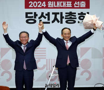 추경호 국민의힘 신임 원내대표가 9일 국회에서 열린 제22대 원내대표 선출 당선자총회에서 당선 확정 후 윤재옥 전 원내대표와 꽃다발을 들고 기념촬영을 하고 있다.