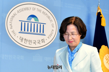추미애 더불어민주당 당선인이 8일 오후 국회 소통관에서 국회의장 출마선언 기자회견을 위해 입장하고 있다.이날 추 당선인은 국회의장이 되면 "개혁국회를 만들어 민생을 되살리겠다"고 밝혔다.