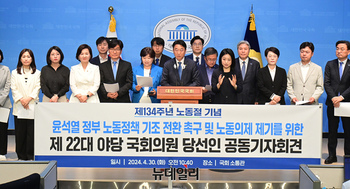 더불어민주당 및 제22대 야당 국회의원 당선인들이 30일 오전 국회 소통관에서 제134주년 노동절 기념 윤석열 정부 노동정책 기조 전환 촉구 및 노동의제 제기를 위한 공동 기자회견을 하고 있다.