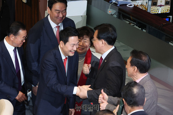 [포토] 의원들과 인사 나누는 장동혁 국민의힘 대표