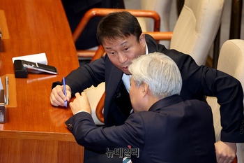 한병도 더불어민주당 원내대표가 4일 국회에서 열린 본회의에서 서왕진 조국혁신당 원내대표와 대화를 나누고 있다.