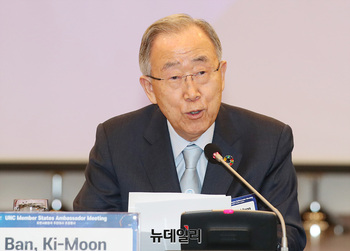 반기문 전 UN사무총장이 5일 오전 서울 용산구 국방컨벤션 태극홀에서 열린 '유엔사회원국 주한대사 초청행사'에 참석해 발언하고 있다. (사진=공동취재단)
