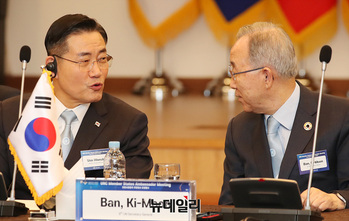 신원식 국방장관과 반기문 전 UN사무총장이 5일 오전 서울 용산구 국방컨벤션 태극홀에서 열린 '유엔사회원국 주한대사 초청행사'에서 대화를 나누고 있다. (사진=공동취재단)