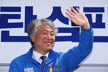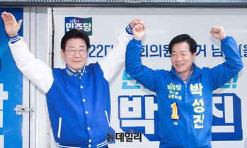 이재명 더불어민주당 상임선대위원장이 4일 오후 울산 BNK경남은행 수암지점 앞에서 열린 선거유세 현장에서 박성진 울산남을 후보와 함께 시민들에게 인사하고 있다. (울산=서성진 기자)
