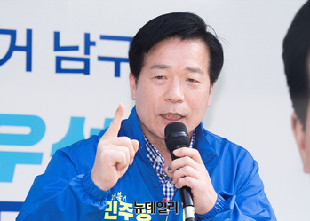 박성진 더불어민주당 울산남을 후보가 4일 오후 울산 BNK경남은행 수암지점 앞에서 열린 선거유세 현장에서 지지를 호소하고 있다. (울산=서성진 기자)