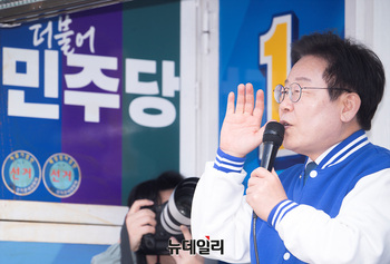 이재명 더불어민주당 상임선대위원장이 4일 오후 울산 BNK경남은행 수암지점 앞에서 열린 박성진 울산남을 후보 선거유세 현장에서 지지를 호소하고 있다. (울산=서성진 기자)