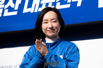 전은수 더불어민주당 울산남갑 후보가 4일 오후 IBK기업은행 울산점 앞에서 열린 선거유세 현장에서 박수를 치고 있다. (울산=서성진 기자)