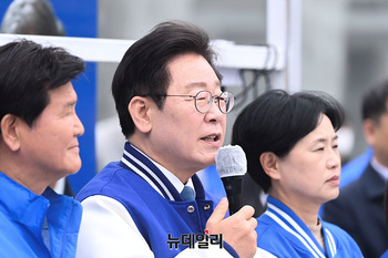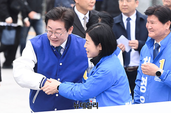 이재명 더불어민주당 상임선대위원장이 4일 오전 부산역 광장에서 부산지역 후보들과 인사를 나누고 있다. (부산=서성진 기자)