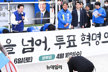 제22대 국회의원선거 사전투표를 하루 앞둔 4일 오전 부산역 광장에서 열린 사전투표독려 퍼포먼스에 앞서 지지자가 이재명 더불어민주당 상임선대위원장에게 절을 하고 있다. (부산=서성진 기자)