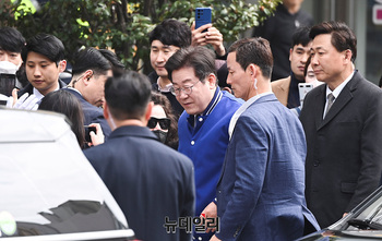 이재명 더불어민주당 상임선대위원장이 4일 오전 부산 롯데하이마트 영도점 앞에서 열린 박영미 부산중·영도 후보 선거유세 현장을 향해 이동하고 있다. (부산=서성진 기자)