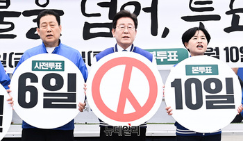 이재명 더불어민주당 상임선대위원장과 정명희 부산북을 후보, 최형욱 부산서·동 후보, 유동철 부산수영구 후보, 서은숙 부산진갑, 이현 부산진을 후보, 변성완 부산강서 후보가 4일 오전 부산역 광장에서 사전투표독려 퍼포먼스를 하고 있다. (부산=서성진 기자)