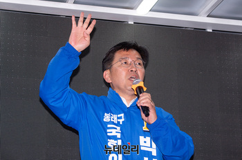 박성현 더불어민주당 부산동래 후보가 3일 오후 부산 서면 젊음의거리 인근에서 열린 더불어민주당 집중유세에서 지지를 호소하고 있다. (부산=서성진 기자)