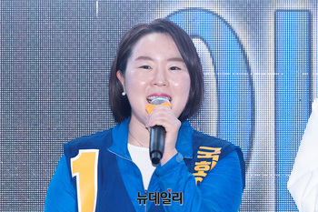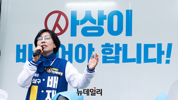 배재정 부산사상 후보가 3일 오후 부산 롯데하이마트 사상점 앞에서 열린 선거유세 현장에서 지지를 호소하고 있다. (부산=서성진 기자)