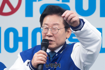 이재명 더불어민주당 상임선대위원장이 3일 오후 부산 개금역 앞에서 열린 이현 부산진을 후보 선거유세 현장에서 지지를 호소하고 있다. (부산=서성진 기자)