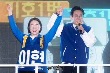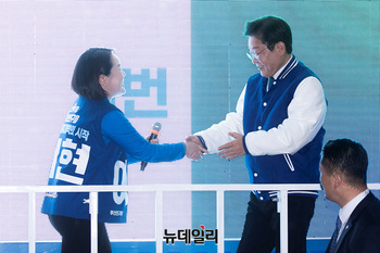 이재명 더불어민주당 상임선대위원장이 3일 오후 부산 개금역 앞에서 열린 선거유세 현장에서 이현 부산진을 후보와 인사하고 있다. (부산=서성진 기자)