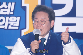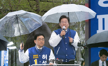 이재명 더불어민주당 상임선대위원장이 3일 오후 경남 창원시 스카이웰빙파크 앞에서 열린 허성무 창원성산 후보 선거유세 현장에서 지지를 호소하고 있다. (경남 창원=서성진 기자)