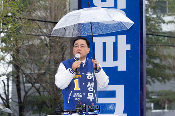 허성무 더불어민주당 창원성산 후보가 3일 오후 경남 창원시 스카이웰빙파크 앞에서 열린 선거유세 현장에서 지지를 호소하고 있다. (경남 창원=서성진 기자)