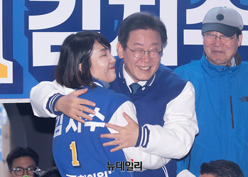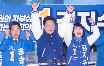 이재명 더불어민주당 상임선대위원장이 3일 오후 경남 창원시 도계부부시장에서 열린 선거유세 현장에서 김지수 창원의창 후보, 송순호 창원마산회원 후부와 함께 지지를 호소하고 있다. (경남 창원=서성진 기자)