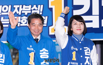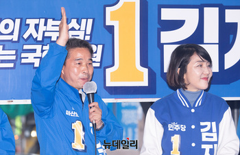 김지수 더불어민주당 창원의창 후보와 송순호 창원마산회원 후보가 3일 오후 경남 창원시 도계부부시장에서 열린 선거유세 현장에서 시민들에게 인사하고 있다. (경남 창원=서성진 기자)