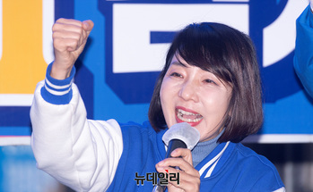 김지수 창원의창 후보가 3일 오후 경남 창원시 도계부부시장에서 열린 선거유세 현장에서 시민들에게 인사하고 있다. (경남 창원=서성진 기자)