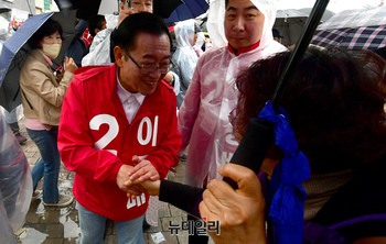 이종배 국민의힘 후보가 3일 오전 충북 충주 성서 차없는거리에서 열린 '국민의힘으로 충주살리기' 유세를 마치고 시민들과 인사를 나누고 있다. (충북 충주=이종현 기자)