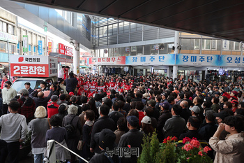 한동훈 국민의힘 총괄선대위원장이 2일 오후 대전 동구 중앙시장에서 열린 '국민의힘으로 동구살리기' 지원유세에서 윤창현 대전 동구 후보와 지지호소를 하고 있다. (대전=정상윤 기자)