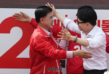 한동훈 국민의힘 총괄선대위원장이 2일 오전 충남 아산시 온양온천역 광장에서 열린 '국민의힘으로 아산살리기' 지원유세에서 이명수(아산갑) 국회의원과 포옹하고 있다. 이 의원은 현역 아산갑 국회의원으로 아산시 후보 지원유세에 나섰다. (충남 아산=정상윤 기자)