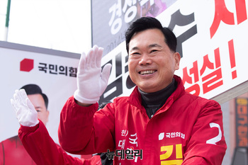 김승수 국민의힘 대구북을 후보가 2일 오전 대구 북구 태전네거리에서 열린 선거유세 현장에서 지지를 호소하고 있다. (대구=서성진 기자)