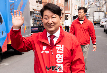 권영진 국민의힘 대구달서병 후보가 2일 오전 대구 달서구 감삼동 일대에서 거리인사를 하고 있다. (대구=서성진 기자)
