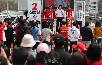 한동훈 국민의힘 총괄선대위원장이 2일 오후 충남 천안시 청당신도시에서 열린 '국민의힘으로 천안살리기2' 지원유세에서 신범철, 이정만, 이창수 천안시 후보들과 차량에 올라 지지호소를 하고 있다. (충남 천안=정상윤 기자)