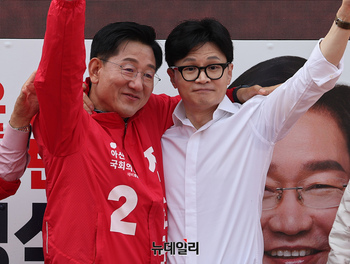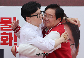 한동훈 국민의힘 총괄선대위원장이 2일 오전 충남 아산시 온양온천역 광장에서 열린 '국민의힘으로 아산살리기' 지원유세에서 김영석 아산갑 후보와 포옹하고 있다. (충남 아산=정상윤 기자)