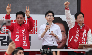 한동훈 국민의힘 총괄선대위원장이 2일 오전 충남 아산시 온양온천역 광장에서 열린 '국민의힘으로 아산살리기' 지원유세에서 김영석 아산갑, 전만권 아산을 후보, 이명수(아산갑) 국회의원과 차량에 올라 지지호소를 하고 있다. (충남 아산=정상윤 기자)