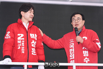 서병수 부산북갑 후보와 박성훈 부산북을 후보가 1일 오후 부산 북구 구포시장 인근에서 열린 선거유세 현장에서 지지를 호소하고 있다. (부산=서성진 기자)