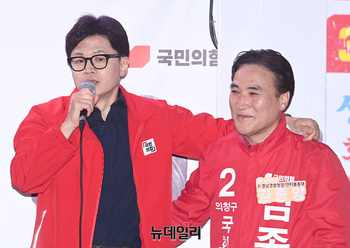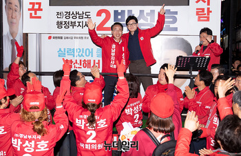 한동훈 국민의힘 총괄선대위원장이 1일 오후 경남 김해시 수리공원에서 열린 선거유세 현장에서 박성호 김해갑 후보와 함께 지지를 호소하고 있다. (경남 김해=서성진 기자)