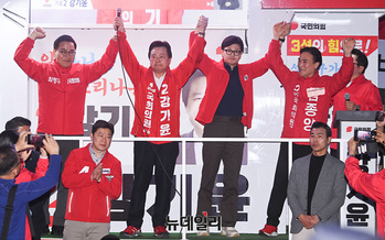한동훈 국민의힘 총괄선대위원장이 1일 오후 경남 창원 성산구 반송시장 앞에서 열린 선거유세 현장에서 강기윤 창원성산 후보, 김종양 창원의창 후보, 최형두 창원마산합포 후보, 진종오 국민의미래 비례대표 후보와 함께 지지를 호소하고 있다. (경남 창원=서성진 기자)