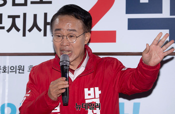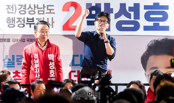 박성호 국민의힘 김해갑 후보가 1일 오후 경남 김해시 수리공원에서 열린 선거유세 현장에서 지지를 호소하고 있다. (경남 김해=서성진 기자)