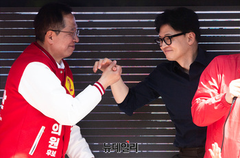 [포토] 한동훈 위원장 손잡은 조승환 부산중·영도 후보