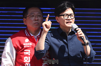 한동훈 국민의힘 총괄선거대책위원장이 1일 오전 부산 남구 LG메트로시티에서 열린 박수영 부산남 후보 선거유세 현장에서 지지를 호소하고 있다. (부산=서성진 기자)