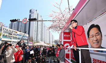 [포토] 만개한 벚나무 앞 지원유세하는 한동훈 위원장