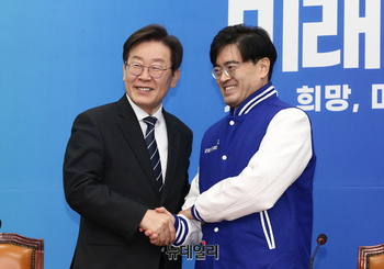 [포토] 이재명 맞는 남인순 송파병 후보